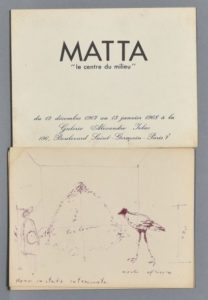 [Roberto MATTA, Jannis KOUNELLIS et Louis FERNANDEZ]. 3 cartes émises à l'occasion d'expositions à la galerie Alexandre Iolas : Matta « le centre du milieu » (1967), Kounellis (1969) et Louis Fernandez (1968) : cartes dépliantes avec reproduction d'une oeuvre.