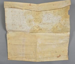 AUDE. Grand parchemin (85 x 40 cm). Abbaye Notre-Dame des Anges des Cassés, 1517. Mouillures claires en haut du document, quelques déchirures. En latin.