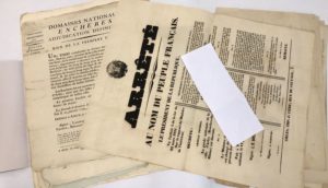 BOUCHES-DU-RHONE. 16 affiches fin XVIIIe-XIXe : Adjudication d'une terre « complantée en oliviers derrière le mas de Matine, situé en Crau [] » (31 déc. 1792). Adjudication d'une maison « appartenant aux ci-devant Jésuites, sise en cette ville d'Arles, paroisse N. Dame la Principale [] » (2 janvier 1793). Adjudication d'un bois appartenant à un condamné (23 brumaire an 3). 3 affiches différentes relatives aux réparations à faire aux chaussées du Trébon de Tarascon « depuis le Pas du Bouquet jusqu'à l'écluse de la tuerie » (an 13 - 1813). Arrêté de l'administration du département des Bouches-du-Rhône du 14 messidor l'an second contenant plusieurs dispositions relatives aux Domaines nationaux. Arrêté de la Cour d'assises d'Aix « portant condamnation à des peines afflictives et infamantes (grande affiche en 4 parties. Aix, 29 janvier 1833 : en particulier sur une attaque à l'acide sulfurique). Décret de dissolution de la garde nationale d'Arles (11 juillet 1850). Avis du maire d'Arles, Remacle, du 16 septembre 1854, sur l'application des dispositions testamentaires de Napoléon (distribution de subsides aux blessés de Ligny et de Waterloo, etc.). Avis du maire d'Arles au sujet des logements militaires (14 mai 1856). Avis du maire d'Arles au sujet du « classement des chevaux, juments, mulets et mules susceptibles d'être requis pour le service de l'armée » (19 mai 1876). Avis du maire d'Arles sur le « recensement général des chevaux et mulets » (2 avril 1876). Arrêté du maire d'Arles sur la suspension des abonnements militaires (7 mai 1856). Avis du maire d'Arles sur le passage du dépôt de remonte d'Agen (Arles, 11 août 1876).