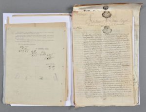 - 17 documents, XVIIIe-XIXe sur la Gironde. Nomination de Bertrand de Gensac à la charge de notaire royal à Landiras (parchemin, 1738), double feuillet imprimé de poèmes de Delacroix « Adieu à la jeune littérature bordelaise » (Bordeaux, avril 1834, avec envoi de l'auteur), 3 intéressantes lettres écrites d'Arcachon par un ostréiculteur, sur le commerce des huîtres et la visite de savants américains dans les centres ostréicoles « pour se rendre compte de la façon dont nous opérons pour obtenir le naissain » (1891-1894), longue lettre (avec bordereau d'expédition et prix) sur l'expédition de vins de Bordeaux en Pologne (1873), [cent-jours] : imprimé de 2 pp. donné à Bordeaux (24-25 mars 1815) sur la réorganisation de la 11e division militaire et les gardes nationales, carte d'électeur pour l'élection d'un député (Bordeaux 1881), 2 circulaires d'armateurs et négociants bordelais donnant les tarifs de leurs vins (Saint-Emilion, Médoc, Graves) et produits coloniaux (1868-1872), testament de Pierre de Casaux président à Mortier au Parlement de Bordeaux « étant affligé de la perte de la vue et très indisposé de corps » (parchemin 1753), bail à ferme de la métairie de Lanchoy paroisse de Montagoudin « payable à Jean Elie Cazaux » (1774), déclaration d'abattage de chênes à Bègles pour le chevalier de Casaux (1788), lettre familiale adressée au consul de la ville de Pellegrue (1781), prospectus manuscrit des messageries Kellerman « par bateau jusqu'à Blaye et delà en voiture », affichette imprimée de la « Compagnie générale de gabariage de la Gironde ».