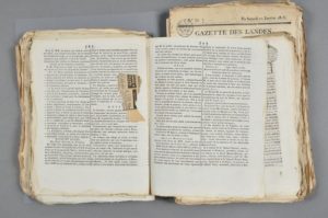 - GAZETTE DES LANDES ou journal politique, administratif et littéraire. 36 numéros pour l'année 1815, du n°35 (21 janvier) à 83 (27 août) + 86, 89, 117, 120, 123, 124 (sauf 36, 44, 45, 48, 51, 55, 61, 65, 66, 69, 70, 73 à 77, 82). Chaque journal se présente sous la forme de 4 pp. in-folio. On joint les n°30 et 32 de 1822.