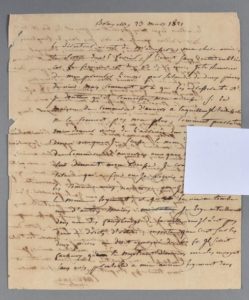 Lettre d'exil. Après des considérations au sujet d'une commande de vins, il évoque son sort et sa famille. « Notre pauvre mère a donc été bien malade. Dis lui combien je suis content d'apprendre sa guérison, combien nous t'avons d'obligation, ma chère amie, combien nous sommes redevables aussi envers Miete [sa soeur] pour les soins que vous donnez à notre mère. Que ne suis-je assez heureux pour les reconnaître. Le tems viendra, j'espère, où je le pourrai. J'ai quelque espoir de recouvrer une partie de mes pertes. Il seroit bien tems que je pusse un peu respirer. Je t'assure qu'il n'y a pas de sorte de chagrin que je n'ay éprouvé. Je dévore tout cela et prends patience [] ».