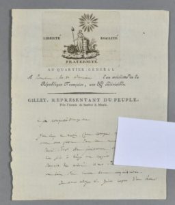 MORBIHAN. Pierre Mathurin GILLET (Lanrelas 1762-1795), conventionnel du Morbihan. L.A.S. à « ses collègues à Bruxelles ». 1 p. ½ in-4, ornée d'une superbe vignette emblématique à son nom : « Gillet représentant du Peuple près l'armée de Sambre & Meuse ». Quartier général de « Petershem » 10 brumaire an 3.