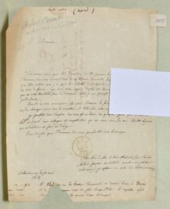 Sur les fouilles à Bavay, l'ancienne cité romaine Bagacum Nerviorum. Il lui a fait parvenir la lettre à transmettre au président de la Société Royale des Antiquaires de France. « Je n'ai rien appris depuis sur Bavai, et ce sera après la récolte que ce riche territoire sera à découvert. Alors, je me propose d'y donner une attention particulière ». Quant à son manuscrit, il demande à Bonvier de Saint-Sauveur de s'en charger. « Je profite de l'occasion de vous faire tenir ces quelques lignes par le célèbre Abel de Pujol mon collègue et compatriote, qui est venu voir son ami []. M. Abel a vu le bronze découvert en dernier lieu à Bavai. Il le [trouve] comme moi du plus beau stile. Il regrette qu'il soit tombé entre les mains d'un étranger ».