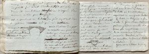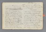 Relation d'une excursion au cirque de Gavarnie en 1833, illustrée de 6 croquis à la plume. Sur la partie droite des pages, le voyageur a inscrit des « notes copiées dans des ouvrages ou recueillies verbalement » et sur la partie gauche, ses propres observations. « Ces notes ont été prises sur les lieux comme rectification ou addition aux notes ci-contre. J'ai fait le voyage de Barèges à Gavarnie, seul et sans guide [] ». Visite du cirque, des cascades, de la grotte « C'est un vaste amphithéâtre de rochers perpendiculaires dont l'aspect nu et décharné présente à l'imagination les ruines d'un amphithéâtre romain, mais avec des proportions tellement énormes, que des géants seuls ont été capables de l'avoir construit. Ses gradins, son sommet sont couverts de neiges. De tous côtés s'échappent des cascades des gaves ou torrents qui se précipitent dans l'intérieur de l'enceinte. Celle-ci est jonchée de décombres et c'était autrefois un grand lac dont les eaux ont rompu les digues et donné cours à un gave formé de toutes les cascades []. La plus belle des cascades est à gauche : elle tombe d'une hauteur de 1266 mètres dans les grandes eaux et celle-ci est projetée loin du roc, et ressemble à un long voile d'argent qui descend, glisse ou se balance en se détachant sur l'immense mur de pierre qui devant vous cache le ciel [] ».