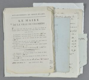 Ensemble de documents sur le prix des denrées de première nécessité à Chambéry durant la Révolution et l'Empire, et l'application du nouveau système métrique dans le département du Mont-Blanc.