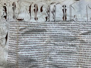 Précieuse bulle pontificale de Jules III pour de l'Abbaye d'Abondance, au sujet du transfert à Claude de Blonay, nouvel abbé commendataire de l'abbaye, par son prédécesseur Dominique Ciclati, d'une pension de 100 ducas d'or. Claude de Blonay fut abbé d'Abondance de 1550 à 1574 ; il a reconnu 4 fils.