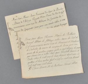 - Reçu A.S. de soeur Anne Eleonore Marie de Béthune d'Orval, abbesse (de 1701 à 1733), pour Madame de Coubertin pour une année de rente viagère due à soeur Elisabeth Jeanne de Valles.
