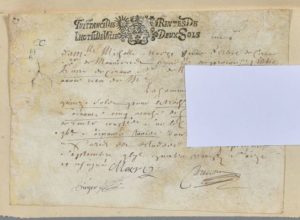 Quittance de la belle-soeur de Savinien : « Michelle Marcy veuve d'Abel de Cirano Sr de Mauvières fondée de procuration d'Abel Pierre de Cirano sieur de Bergerac » de la somme de 18 livres 15 sols pour trois quartiers de rente sur le clergé. [Abel II de Cyrano de Bergerac (né en 1624), frère cadet de Savinien, avait pris le titre de « sieur de Mauvières » à la mort de leur père en 1648 ; il épousa Michelle Marcy en 1649].