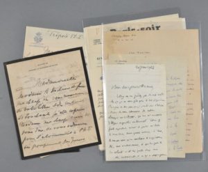 - 14 lettres et 4 cartes : Ernest Daudet, Georges Clemenceau (cv autographe), Franchet d'Esperey, Joseph Caillaux, Joffre, Anton Lang (signature certifiée), baron de Woelmont, Irène de Nobili, Julia Bartet, François Coppée, etc.