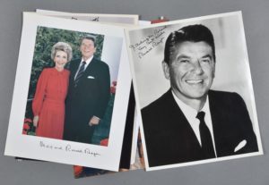 Ronald REGAN (belle photo dédicacée), Nancy REAGAN (signée), Ronald & Nancy REAGAN (signée par les deux + 1 reproduction), Jimmy CARTER (dédicacée à Bobby Kelso), Rosalynn CARTER (déd.), Marie FORD (signée et datée) + un contretype d'une photo de 4 présidents américains (de Nixon à Reagan) signée par Jimmy CARTER et Gerald FORD.