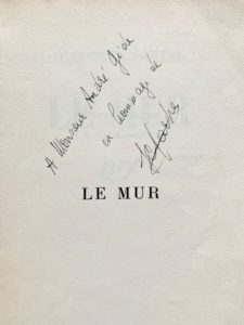 Jean-Paul SARTRE. Le Mur. Paris, NRF, 1939. In-8 (12,2 x 18,8 cm), broché. Déchirures aux mors, quelques pâles piqûres. Dos discrètement recollé.