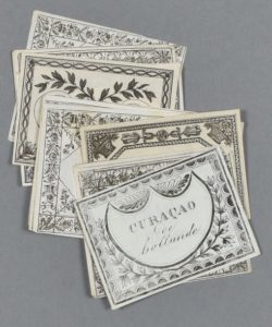 ETIQUETTES. Ensemble de 12 étiquettes du XVIIIe, en parfaite condition, en moyenne 5/6 x 7/8 cm.