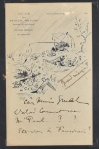 Lettres de peintres (majoritairement) et d'écrivains. Léon BONNAT, Charles DUFRESNE (longue lettre de 8 pp. illustrée de 14 scènes), Léopold MARCHAND (avec 3 dessins dont un autoportrait), Henri CHAPU (beau dessin d'une sculpture), Pierre COMBET-DESCOMBES (dessin d'une palette sur l'enveloppe), Georges CLAIRIN (scène orientaliste sur fragment de lettre), Claude VIGNON, Edouard DETAILLE (illustrée de 2 petits dessins), Pierre-Adrien BOUROUX (avec 2 dessins de calèche), Ernest HÉBERT (avec plusieurs croquis au crayon), Eugène LE POITEVIN, Jules-Arsène GARNIER, Michel GEORGES-MICHEL (avec très belle composition florale à la gouache), etc.
