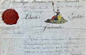 « Dieu Patrie » (aquarellée) avec devises républicaines calligraphiées à la plume, Comité de Salut Public (gravée par Quéverdo), lettre d'un soldat de la Grande armée, etc.