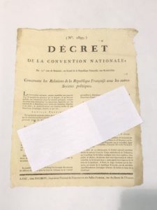 Affiche du décret de la Convention nationale du 27 brumaire an 2 [17 nov. 1793] concernant les relations de la République française avec les autres sociétés politiques, et plus particulièrement avec les Etats-Unis d'Amérique. « Article premier. La convention nationale déclare au nom du peuple François, que sa résolution constante est d'être terrible envers ses ennemis, généreuse envers ses alliés, juste envers tous les peuples. II. Les traités qui lient la France aux Etats-Unis d'Amérique & aux cantons, seront fidèlement exécutés [] V. Le comité de Salut public est chargé de s'occuper des moyens de resserrer de plus en plus les liens de l'alliance & de l'amitié qui unissent la République françoise aux cantons suisses & aux Etats-Unis d'Amérique. VI. Dans toutes les discussions sur les objets particuliers de réclamations respectives, il prouvera aux cantons & aux Etats-Unis, par tous les moyens compatibles avec les circonstances impérieuses où se trouve la République, les sentiments d'équité, de bienveillance & d'estime dont la nation Françoise est animée envers eux [] ».