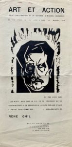 [ART ET ACTION]. Très curieux document imprimé (40 x 20 cm), « Art et Action pour l'affirmation et la défense d'oeuvres modernes », orné d'une grande gravure sur bois d'inspiration cubiste, [vers 1925]. Plié en deux.