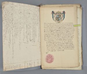 - Famille des comtes de Bavière de Grosberg. Ensemble de documents manuscrits datés de 1749, dont 3 sont illustrés des armoiries (encre et aquarelle) de la famille, avec 3 certificats héraldiques, l'un délivré et signé par le premier Roi d'Armes de la Toison d'Or des Pays-Bas et de Bourgogne.