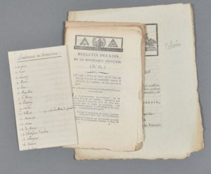- 4 pièces imprimées : Loi relative au commerce du Sénégal (1791, 2 exemplaires). Loi qui déclare que les colons des Isles-du-Vent qui ont constamment repoussé le fédéralisme et le royalisme, ont bien mérité de la Patrie, du 17 brumaire an 3. Loi contenant division du territoire des colonies occidentales du 4 brumaire an 6.