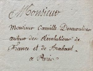 [Camille DESMOULINS (1760-1794)]. L.A.S. « Raillard » à Camille Desmoulins « auteur des Révolutions de France et de Brabant, à Paris » [adresse au dos]. 2 pp. ½ in-4. Petit manque d'une bande de papier en bas du feuillet d'adresse. Paris, 23 octobre 1790. Cachet « papiers Cam. Desmoulins ». Orthographe approximative.