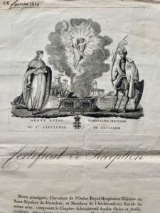 ORDRE DU SAINT-SÉPULCRE DE JÉRUSALEM. Dossier concernant la réception de Jean Godard « doyen des juges de Paix »e, 1819.