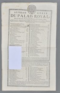 VINS ET ALCOOLS. Belle petite affiche du XVIIIe « A l'Orangerie du Palais Royal » « Bouche de Mgr le Duc d'Orléans ». 40,5 x 25 cm. Pliures. Petit trou sans gravité.