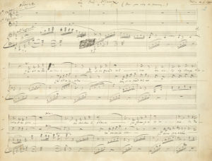 COPPÉE : « J'ai dit au Ramier : pars »..., en fa à 3/4, est marqué Allegretto. C'est, écrit Gérard Condé, « une gracieuse fantaisie sur une formule d'arpège passant d'une voix à l'autre et des voix au piano, avec des suspensions charmantes et des superpositions d'une sonorité exquise. Les trois strophes, en outre, sont différentes ». Le manuscrit, à l'encre brune au recto de 5 feuillets de papier Lard- Esnault à l'italienne à 14 lignes, à trois systèmes de 4 portées par page (2 systèmes sur la dernière page) présente quelques ratures et corrections. Il est signé et daté en fin daté « L. D. février 77 ». Ce duo a été publié dans le recueil posthume des Seize Mélodies (Heugel, 1891, n° 11).