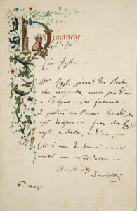 DONIZETTI Gaetano (1797-1848)L.A.S. « Donizetti », [dimanche ?] 6 mars [1842 ?], à Gioacchino ROSSINI ; 1 page in-8 ornée d'une jolie lettrine chromolithographiée au mot Dimanche, adresse ; en italien. M. REGLI, gérant du Pirate, arrivera avant...