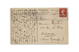 FALLA MANUEL DE (1876-1946)L.A.S. « Manuel de Falla », Paris 14 août 1911, à Maurice RAVEL, à Ciboure (Basses-Pyrénées) ; au verso d'une carte postale illustrée d'un portrait de l'Infante Marguerite par Velasquez, avec adresse, le texte se...