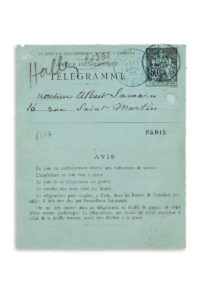 FAURE Gabriel (1845-1924)L.A.S. « Gabriel Fauré », 154 bd Malesherbes [Paris 13 avril 1896], à Albert SAMAIN ; 1 page in-12, adresse (télégramme). « Je compose un duo sur votre ravissante poësie : Larmes aux fleurs suspendues, Larmes de...