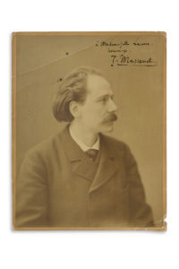 MASSENET Jules (1842-1912) compositeur.PHOTOGRAPHIE avec dédicace autographe signée « J. Massenet » ; environ 28 x 22 cm contrecollée sur carton (plis). Portrait de profil, dédicacé « à Mademoiselle Lacour. Hommage »...