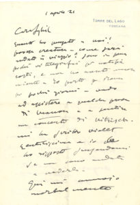 PUCCINI Giacomo (1858-1924)L.A.S. « Giacomo », Torre del Lago 1er avril 1921, à Sybil SELIGMAN ; 2 pages petit in-4 à son adresse ; en talien. Comme il a pensé à elle ! Pauvre créature... Il part pour Rome dans les jours prochains, pour...