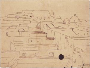 Bel et rare enseMBle. Début de la nouvelle Oum-Zahar, recueillie dans Au pays des sables (Fernand Sorlot, 1944), un feuillet in-fol. recto-verso paginé 1-2 : « Dans la vaste chambre basse, aux murailles irrégulières, en argile jaune, on avait couché la mère sur une natte. On l’avait recouverte d’un voile bleu sombre qui dessinait en des angles raides sa forme immobile. Elle était morte »… Lettre en arabe, Alger 23 décembre 1902, sur papier à en-tête d’Akhbar, journal d’Alger (3 pages in-8). Deux dessins à l’encre violette (15,5 x 20,5 cm) : vues des toits d’une ville arabe, paysage montagneux avec une mosquée sur une colline.