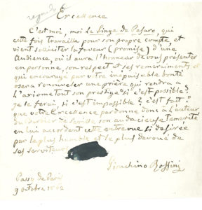 Singe de Pesaro, qui cette fois travaille pour son propre compte, et vient solliciter la faveur (promise) d'une audience, où il aura l'honneur de vous présenter en personne, son respect et ses remerciements et qui encouragé par votre inépuisable bonté osera renouveler une prière qui rendra à l'axiome tout son prestige “si c'est possible ? je le ferai, si c'est impossible ? c'est fait”. Que votre Excellence pardonne donc à l'auteur du Barbier de Séville son audacieuse témérité en lui accordant cette entrevue »...
