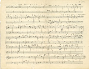 Jean-Louis FAURE (1863-1944) : « Sonnez toujours, clairons de la Victoire »... L'Hymne à la Paix (op. 159) a été composé en 1919, et publié dans le Supplément musical du Figaro du dimanche 9 mai 1920, puis chez Durand, pratiquement en même temps. Le manuscrit est noté d'une écriture rapide, à l'encre noire, sur une feuille à l'italienne à 12 lignes, avec le timbre sec de Lard-Esnault-E. Bellamy, en six systèmes de deux portées, la portée supérieure contenant la ligne de chant et la main droite du piano. Ces 72 mesures, en si bémol, correspondant à la première partie de l'oeuvre qui compte en tout 201 mesures. Au verso, on relève une ébauche de 13 mesures, début d'une pièce pour violon et piano, suivi de quelques esquisses.