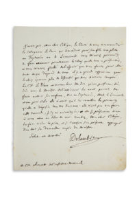 DELAMBRE Jean-Baptiste-Joseph (1749-1822) astronome.L.A.S. « Delambre », au citoyen ARNAULT de l'Institut National ; 1 page in-4. Il recommande à son collègue la citoyenne LEBLANC « qui demandoit pour son fils une place au Prytanée ou à...