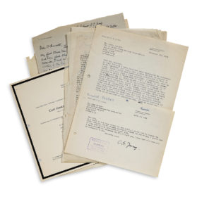 correspondance sur ses émissions radiophoniques à la BBC. Elle est adressée à Hugh BURNETT, producteur de l'émission Face to Face sur la BBC, où Jung expliquait ses idées au grand public. 17 avril 1959. Jung convient d'un rendez-vous avec Burnett et John Freeman. 16 novembre 1959, il exprime sa satisfaction à constater le succès remporté par l'émission mais s'avoue peu enthousiaste à l'idée d'y participer à nouveau, éprouvant une certaine réticence à l'idée de se faire encore de la publicité aussi rapidement. Il n'est ni politicien ni vedette de cinéma. La réponse à la popularité, c'est la modestie. Il ne veut pas imposer de nouveau sa présence aux téléspectateurs. Ils pourraient bien se lasser de lui et il s'attirerait leur hostilité... L'impact que peut avoir sur lui l'agitation inhabituelle d'une telle représentation l'effraie quelque peu ; et il est âgé... 5 décembre 1959. Il précise sa pensée lorsqu'il a parlé dans l'émission de la “connaissance” de Dieu. Il sait qu'il s'agit d'une conception peu conventionnelle, et il comprend tout à fait que l'on puisse se demander s'il est chrétien. Il se considère pourtant chrétien, puisque sa pensée se fonde entièrement sur des concepts chrétiens. Il tente seulement d'échapper aux contradictions internes du christianisme, en adoptant une attitude plus modeste, qui prenne en considération les vastes ténèbres qui règnent dans l'âme humaine. La religion chrétienne a prouvé sa vitalité à travers une évolution permanente, à l'instar du bouddhisme. L'époque actuelle requiert de toute évidence de nouvelles opinions à cet égard car, en matière d'expérience religieuse, on ne peut pas continuer à penser comme dans l'Antiquité ou au Moyen Âge... Il remercie pour les photos : c'est un enrichissement personnel que de découvrir des preuves indéniables de la stupidité de l'expression du visage... 30 juin 1960, il se lance dans une longue explication sur les raisons pour lesquelles il ne souhaite pas être interviewé une seconde fois par un soi-disant professionnel ; il se méfie quelque peu de ses confrères, après de trop nombreuses expériences fâcheuses impliquant notamment des malentendus et des préjudices inutiles, comme : les archétypes sont des idées métaphysiques, ils sont mystiques, n'existent pas ; Jung est philosophe, il a un complexe d'Électre envers Freud et ainsi de suite... Il évite autant que possible les interviews avec ceux de ses confrères qui recherchent des informations de base. Il évite également les gens qui affichent une attitude antagonique dès le départ, qui ne souhaitent écouter que leurs propres idées et non les siennes... Il est las de parler avec des gens qui ne connaissent même pas le b.a.-ba de la psychologie... Puis il raconte l'épouvantable expérience de son interview par un professeur américain... 5 août 1960. Il revient sur son grand âge (85 ans) et son état de santé ; il est temps de prendre des vacances, et de passer le relais à la jeune génération... On joint : la copie carbone de sa lettre du 5 décembre, destinée à un autre correspondant sur le même sujet, et une déclaration publique dactyl. préparée à partir de celle-ci, intitulée Statement from Professor Jung ; plus 2 L.S. de sa secrétaire Aniela JAFFÉ (1960-1961) ; une longue l.a.s. de Ruth BAILEY (10 janvier 1960) au sujet des réactions de Jung au film ; une l.s. de William McGuire de Princeton University Press au sujet d'un projet d'édition de ces entretiens (27.IV.1979) ; et une double dactyl. de réponse de Burnett (11.VII.1961) ; le faire-part de décès de Jung. ; on trouve également, joint aux lettres précédentes,