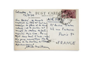 LÉVI-STRAUSS Claude (1908-2009) ethnologue.Carte postale a.s. « Claude Lévi-Strauss », Calcutta 13 septembre 1950, à André BRETON ; carte postale illustrée (Jain Temple, Calcutta), texte et adresse au verso, timbre et cachet postal....