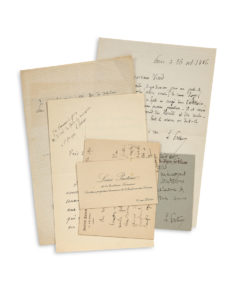 Paris 26 octobre 1886, au sujet de sa recommandation « pour un poste de garçon de bureau, d'Eugène Loye : « Il est mon compatriote jurassien, paraît très honnête et très docile »... Arbois 17 août 1887, il demande « une feuille imprimée des conditions d'admission dans les bureaux du Crédit Foncier »... Paris 18 septembre 1890, recommandant une demande : « vous donnerez au Crédit Foncier un employé précieux si cette pétition peut aboutir promptement »... - Indications à Viard pour distribuer « les cent obligations de M. Pasteur : 50 à Mme veuve Vallery- Radot mère, 25 à lui-même, 12 à René Vallery-Radot [son gendre], et 13 « à faire remettre chez M. Pasteur 45 rue d'Ulm ». On joint une lettre du docteur Foderé, priant Pasteur de recommander une demande d'admission aux examens du Crédit foncier, avec apostille a.s. de Pasteur, priant Viard de faire le nécessaire (1er décembre 1888) ; et une P.S. de Pasteur à en-tête du Crédit Foncier de France, accusé de réception d'un pli (une demi-page in-8). Il est joint deux cartes autographes signées de Pasteur à Viard sur le même sujet, un billet autographe non-signé, un avis signé, et une lettre (6 octobre 1888) portant une apostille signée de Louis Pasteur datée du 1er décembre 1888. Et une carte de visite.