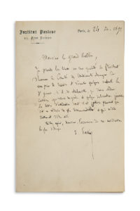 PASTEUR Louis (1822-1895)L.A.S. « L. Pasteur », Paris 24 février 1892, au Grand Rabbin [Zadoc KAHN ?] ; ¾ page in-8 à en-tête Institut Pasteur. En sa qualité de Président d'honneur du Comité des Étudiants étrangers, Pasteur prie le Grand...
