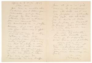 RENOIR Auguste (1841-1919) peintre impressionniste.L.A.S. à Téodor de Wyzewa. Cagnes, 8 mai 1915. 2 pp. bi-feuillet in-12 oblong. Renoir remercie Wyzewa pour l'envoi de son livre, La Nouvelle Allemagne. (...) L'on est en France peu au courant de la...