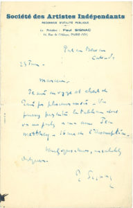 SIGNAC Paul (1863-1935)L.A.S. à Claude Monet. Port en Bessin (Calvados), 23 juin. 1 pp. bi-feuillet in-8, en-tête de la Société des Artistes indépendants. À propos de la remise d'un tableau en dépôt. Je suis en voyage et absent de Paris pour...