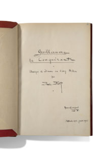 rouge, reliure demi-maroquin rouge à coins, dos à nerfs, tête dorée (Bernasconi). Manuscrit original complet de cette chronique et drame. La pièce paraîtra, acte par acte, entre avril et octobre 1927, dans le Mercure de France, sous le titre Guillaume le Bâtard, ou la Conquête de l'Angleterre, chronique de France en 5 actes ; elle ne semble pas avoir été représentée. Le drame met en scène Edward le Confesseur, roi d'Angleterre, Harold comte de Wessex « puis roi national des Anglais », Guillaume le Bâtard, duc de Normandie, « roi d'Angleterre au dernier acte », le Pape Alexandre II, l'archevêque de Cantorbéry, etc., pas moins de 29 personnages, sans compter les guerriers, moines, soldats, etc., plus deux personnages invisibles, « au Ciel ». Chaque acte porte un titre : I Edward le Confesseur (à Londres), II Hildebrand (à Rome), III Sigurd Longuepête (à Bayeux), IV Edith au Cou de Cygne (les dunes de Saint-Valery, à l'embouchure de la Somme), V Harold (près d'Hastings). Le manuscrit présente quelques ratures et corrections On a relié en tête 2 L.A.S. à Antoine GIRARD, 1925-1926 (3 pages et demie in-4 ou in-8), avec une photographie dédicacée de ses enfants Hélène et François, lui faisant hommage du manuscrit de cette pièce « shakespearienne », « le plus important ouvrage que j'aie jamais entrepris », qu'il souhaite présenter au directeur de l'Odéon Firmin Gémier : c'est « en même temps qu'une étude psychologique très poussée, une fresque tumultueuse de cette époque magnifique et puissante, où, je le reconnais, traîne de la “barbarie”, mais enfin d'une ardeur, pour soutenir ses convictions, insurpassable, une fresque du XIe siècle anglais, français, normand, et même italien, où l'on vit l'Angleterre conquise par des Français, [...] et se “heurter” les plus grands problèmes qui nous agitent encore »...