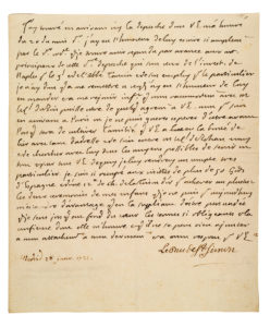 demander la main de l'Infante au nom de Louis XV. Il a répondu par le dernier courrier aux principaux points de la dernière dépêche de Son Éminence, au sujet de « l'invest[iture] de Naples pour le général et de l'abbé TENCIN et de son employ pour le particulier » [il s'agit de l'investiture de Charles VI, les Espagnols devant évacuer les royaumes de Naples et de Sicile en vertu du traité de 1720 entre l'Espagne et les alliés]. Il se réjouit « que mon raccommodement avec M. le C[ardina]l DUBOIS puisse estre de quelque agrement à V.E. Mon p[remi]er soin en arrivant à Paris où je ne puis gueres esperer avant Pasques sera de cultiver l'amitié que V.E. a eu la bonté de lier avec tant dadresse et de soin entre M. le Cl de RO HAN et moy et de chercher avec luy tous les moyens possibles de servir en tout et par tout V.E. De quoy je luy rendray un compte tres particulier. Je suis occupé aux visittes de plus de 50 Grands d'Espagne et d'une 12e de Ch[evaliers] de la Toison d'or pour achever au plustost les deux ceremonies de mes enfants [Saint-Simon avait obtenu pour eux la Toison d'or] que je ne puis pour aujourdhuy m'estendre d'avantage qu'en la suppliant d'estre persuadée que je sens jusqu'au fond du coeur les termes si obligeants de la confiance dont elle m'honore »... PROVENANCE Ancienne collection du comte Claude de FLERS, vente Souverains et Princes de France, 27 mars 2007, n° 164.