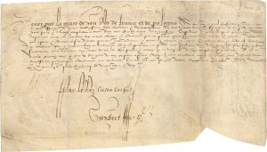 Mandements au trésorier de son Épargne Pierre MOllan. Blois 23 mai 1581. Don à Thomas de lOrMe de 500 écus en considération des « services quil nous a faictz depuis treize ans soubz le Sr de BirOn mareschal de France en toutes les negociations auxquelles il a esté employé »… Paris 30 juin 1585. Remboursement à Philippe Chatart de cent écus, payés « pour la composition de sergent priseur vendeur de biens meubles en la Seneschaussée et siege presidial de Lyon »… 25 août 1585. Paiement de mille écus à sons conseiller et secrétaire Louis POtier sieur de gesvres pour ses vacations… 15 décembre 1585. Remboursement à Barthélemy de la hOussaye, capitaine de gens de pied, de 1200 écus, « somme qu’il a paiée & advancée de ses deniers par notre commandement et pour noz affaires »… On jOint une autre P.S., 21 octobre 1580, en mauvais état : gratification de mille écus au S. de saint-viDal.