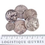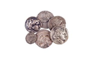 Macédoine Alexandre le Grand tétradrachme 16,97 gr. TB. Ionie Ephèse cistophore 12,36 gr. TTB. Ile de Thrace Thasos tétradrachme 15,96 gr. TTB. Attique Athènes tétradrachme 16,83 gr. TB à TTB. Joint 2 monnaies Parthes tétradrachme 11,63 gr. TB+ et drachme 3,66 gr. Sup.