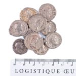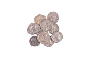 10 deniers : Vespasien 69-79 ap. JC. Trajan 98-117 ap. JC. Sabine +137 ap. JC. Faustine +141 ap. JC. Marc-Aurèle 161-180 ap. JC. Septime Sévère 198-211 ap. JC. Caracalla 198-217 ap. JC. ( 2 ex ). Julia Mamée +235 ap. JC. Alexande Sévère 222-235 ap. JC
