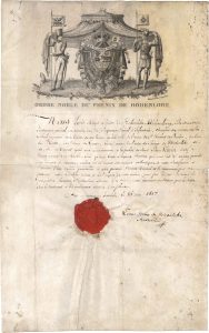 Château de Lunéville 15 juin 1817. Brevet sur vélin, sous grande vignette gravée de l’Ordre noble du Phénix de Hohenlohe, pour Pierre Voirin, de Nancy, qu’il nomme « notre Conseiller intime et le Banquier de notre maison »… Paris 15 novembre 1827, à un baron, demandant une traduction certifiée de son extrait de baptême, nécessaire « pour l’expedition de mes lettres de grande naturalisation »…