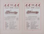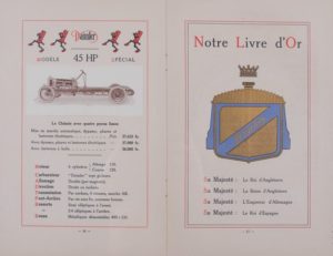 Livret à reliure cartonnée à motifs floraux et titre doré. Imprimeur “Prieur Dubois, Puteaux -Paris”. 4 illustrations collées et nombreuses illustrations imprimées en couleur. Descriptifs des modèles et caractéristiques des châssis. En fin de cet exemplaire est imprimée une liste des principaux clients renommés de la marque automobile (S.A.R. Le Prince de Galles, S.A.R. Le Prince de Suède…).