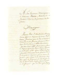 Cet ancien officier au régiment Royal Italien en 1776 puis intendant ordonnateur de la garnison de Monaco en 1786, supplie Berthier d’intervenir pour lui faire accorder une place de commissaire de Guerre :”son désir ayant toujours été d’employer ses jours au service de l’état et donner des nouvelles preuves de son zèle, de sa fidélité et de son constant attachement au gouvernement français. Ce désir est d’autant plus vif aujourd’hui que ce gouvernement est consolidé par l’heureux avènement au trône Impérial de l’auguste monarque qui fait le bonheur du peuple français”.